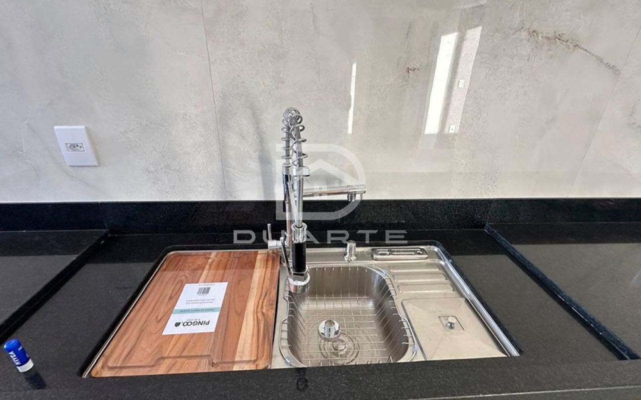 - Cuba dupla completa de aço inox com torneira gourmet, lixeira embutida, tábua exclusiva e saboneteira;