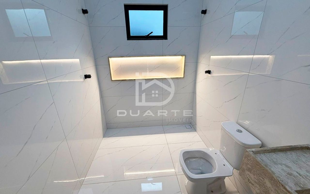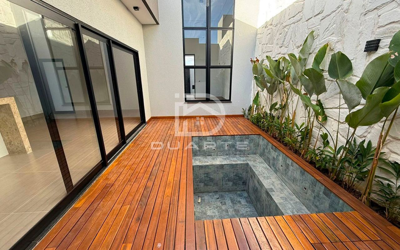 - A casa possui porta de acesso em alumínio preto, esquadrias de alumínio, iluminação em LED, deck de madeira, piscina alvenaria e revestimento, pedra portuguesa e pedras naturais.