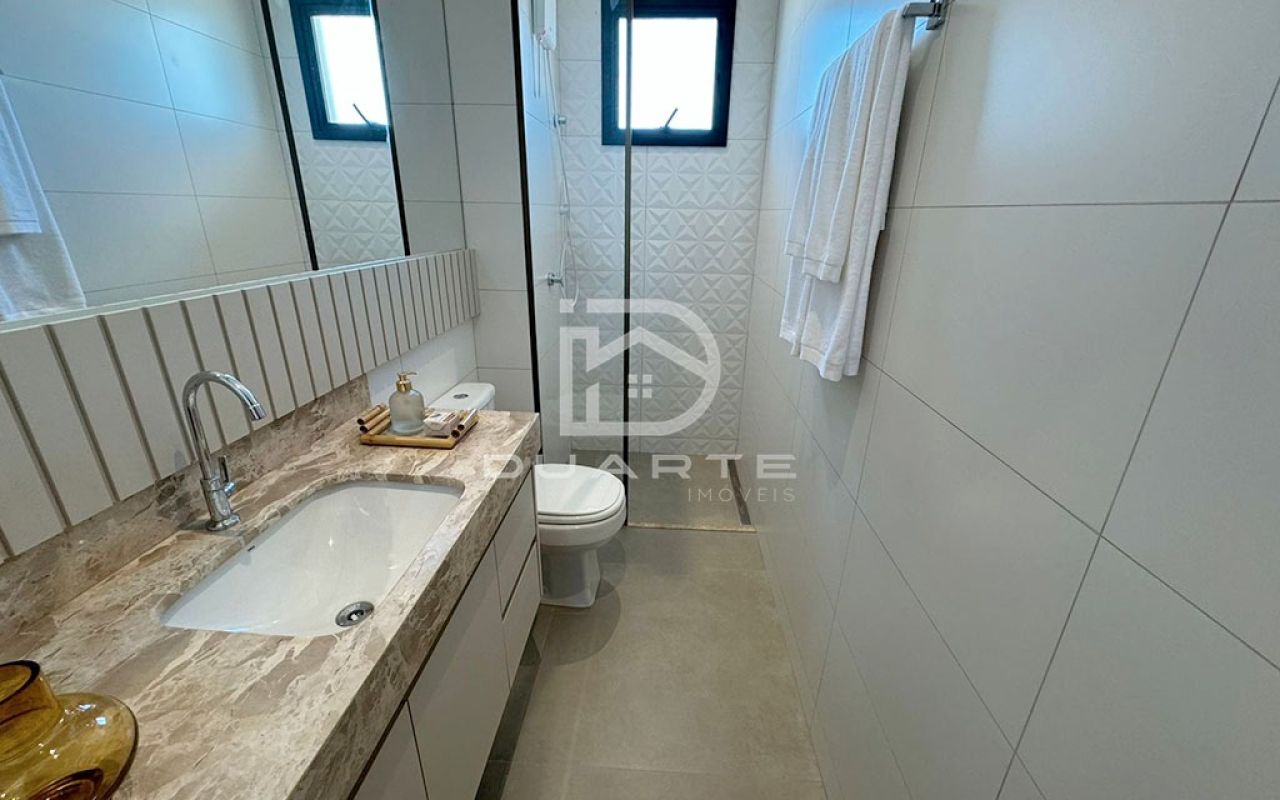 - Bancadas em mármore nos banheiros e granito na cozinha;